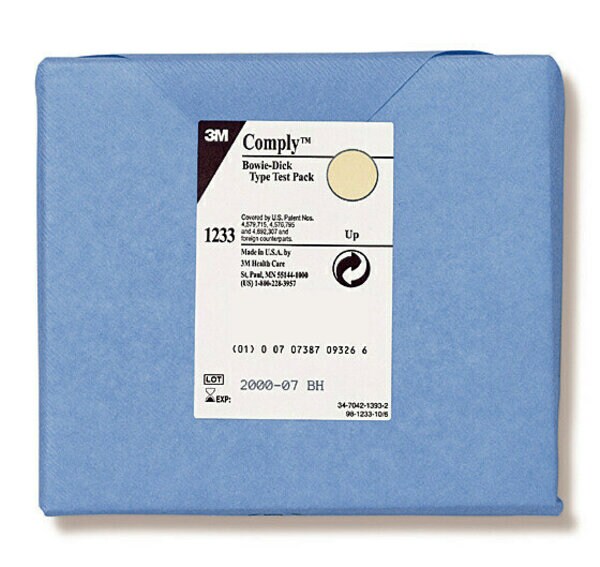 Die 3M™ Comply™ Bowie-Dick-Testpackung 1233LF dient der Maschinenkontrolle, die zum täglichen Testen der Entlüftungseffizienz von Dampfsterilisatoren mit dynamischer Entlüftung bei 132–134 °C durchgeführt wird.