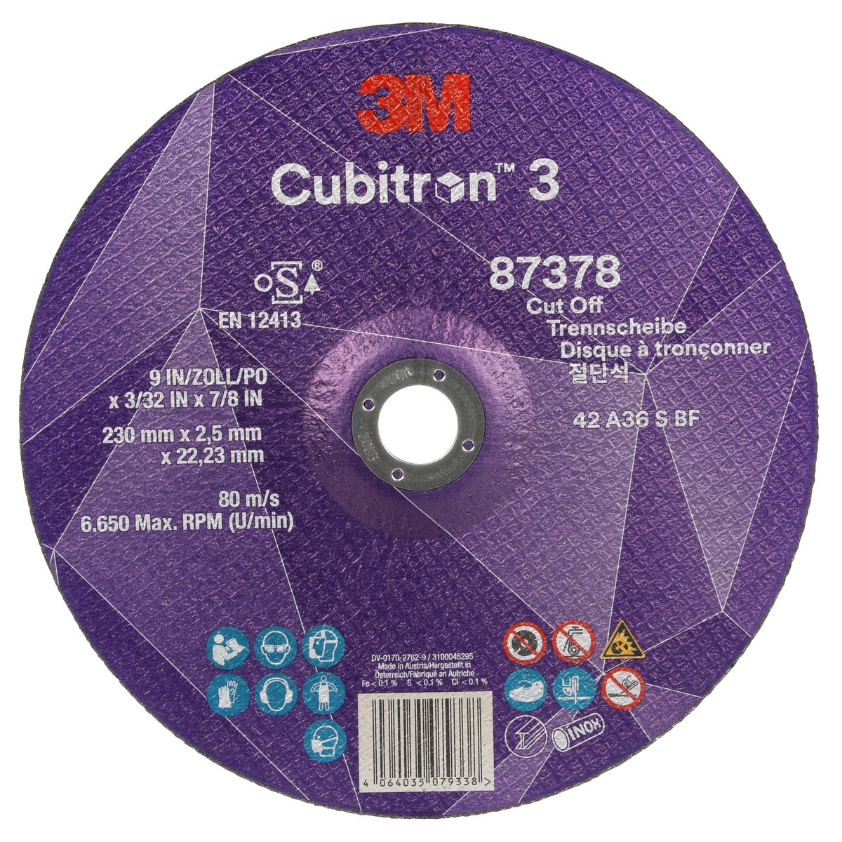 Nutzen und Einsatzmöglichkeiten von "3M™ Cubitron™ 3 Trennscheibe, 87378, 36+, T42, 230 mm x 2,5 mm x 22,23 mm, EN, 25/Pack, 50 Stück/VE"