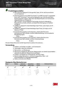 Die 3M™ Envision™ Print Wrap Folie 480mC ist eine PVC- und phtalatfrei Digitaldruckfolie für die schnelle und sichere Applikation auf allen ebenen, einfach und komplex verformten Untergründen ohne und mit Nieten. Sie ist mit allen UV- und Latex Druckfarben bedruckbar, viele lösungsmittelbasierte Druckfarben erzielen ebenfalls gute Druckergebnisse. Sie zeichnet sich durch ihre hohe Verformbarkeit bei zahlreichen Langzeitanwendungen aus, z. B. für Innen- und Außenwerbung, Fahrzeugwerbung sowie Verklebung auf Wasserfahrzeugen und strukturierten Wänden. Ausgestattet mit der 3M™ Controltac™-Technologie wird bei der Applikation der Folie eine besondere Positionierbarkeit möglich. Dabei dient der Klebstoffsystem als mechanischer Abstandshalter zum Untergrund. 3M™ Controltac™ ist innerhalb eines großen Temperaturbereichs wirksam. Dies vereinfacht die Installation großformatiger Grafiken. 3M™ Comply™ ist eine Klebstoff-Technologie, die durch Luftkanäle im Klebstoff eine schnelle, einfache und blasenfreie Anbringung von Grafiken ermöglicht.