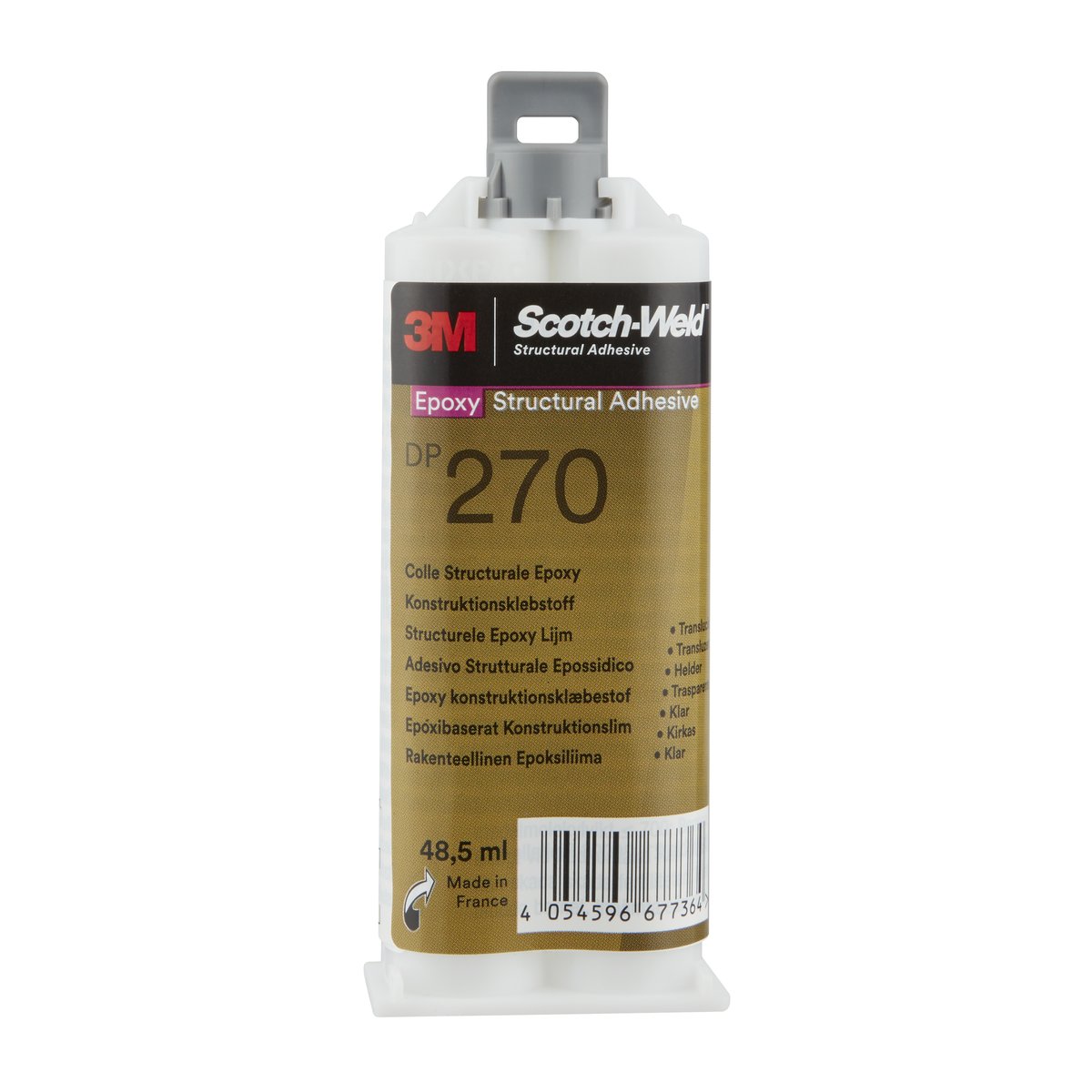 3M™ Scotch-Weld™ DP 270 ist ein 2-Komponenten-Konstruktionsklebstoff auf Epoxidharzbasis. Das Produkt ist UL-gelistet und kann als Vergussmasse eingesetzt werden. Verarbeitungszeit bei Raumtemperatur 70 Minuten – Handfestigkeit nach 3 Stunden