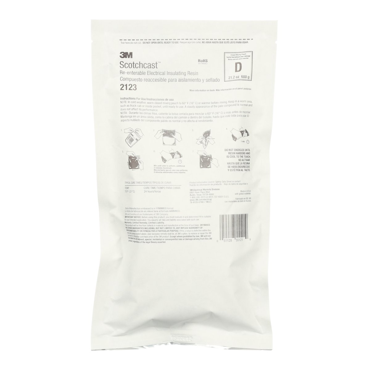 3M™ Scotchcast™ Kabelharz 2123 hat gute Benetzungs- und niedrigviskose Eigenschaften. Dieses weiche, flexible Harz härtet bei Raumtemperatur aus und dient als Isoliermaterial für Kabelspleiße, die bis zu 1 kV betrieben werden. Es fließt leicht, auch bei niedrigen Temperaturen, während es das Gehäuse füllt und Hohlräume minimiert. Es ist nach ASTM, CENELEC HD 623.S1 (EN50393) geprüft und ist 2011/65/EU (RoHS) sowie 1907/2007/EC (REACH) konform.