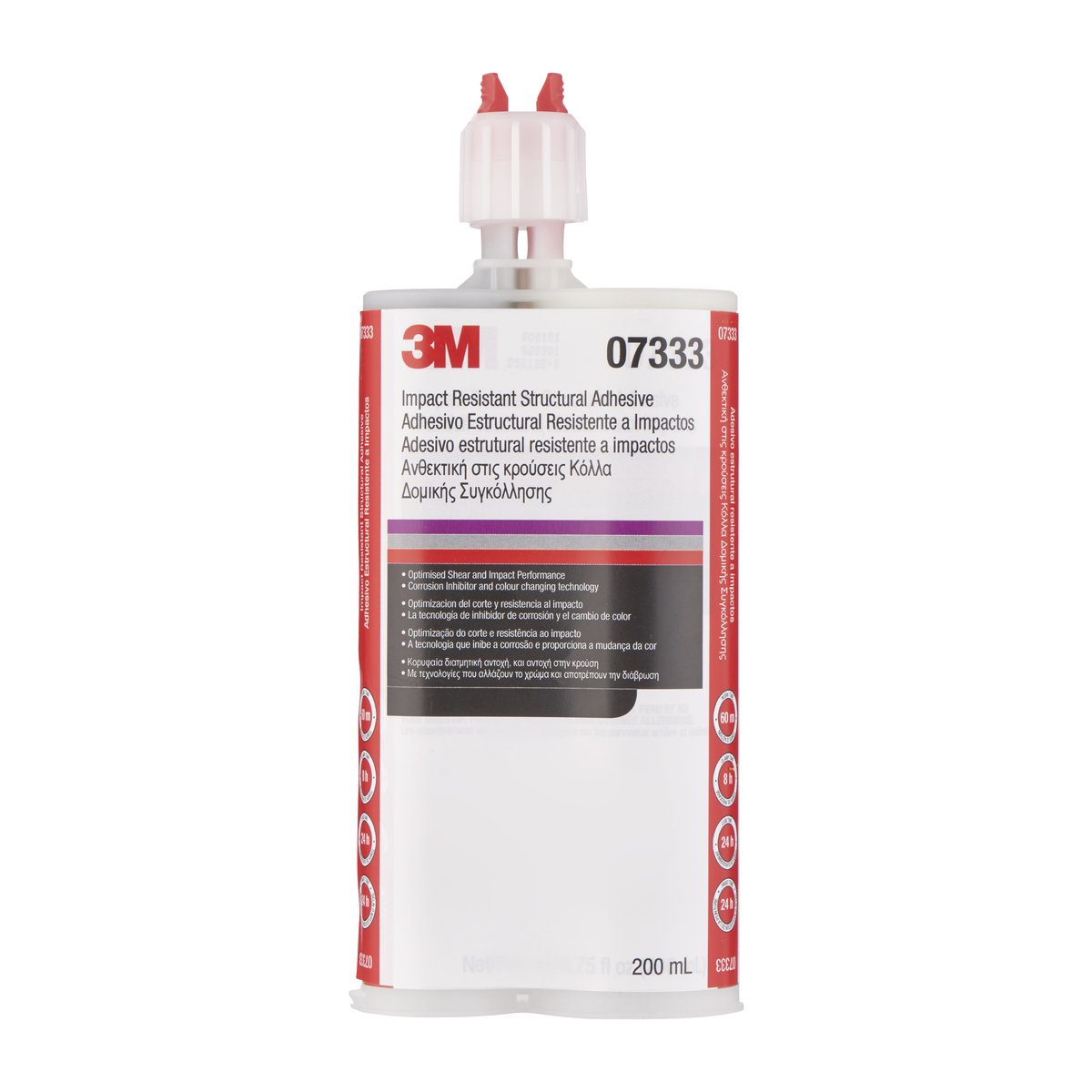 3M™ Strukturklebstoff (IRSA) ist speziell entwickelt für die OEM-Anforderungen, mit erhöhter Anforderung an die Schlagfestigkeit. Dieser Zwei-Komponenten-Epoxidklebstoff bietet eine verlängerte offene Zeit – bis zu einer Stunde – und kann mit Wärmezufuhr beschleunigt ausgehärtet werden. Der Klebstoff wechselt beim Aushärten die Farbe von Silber zu Violett.