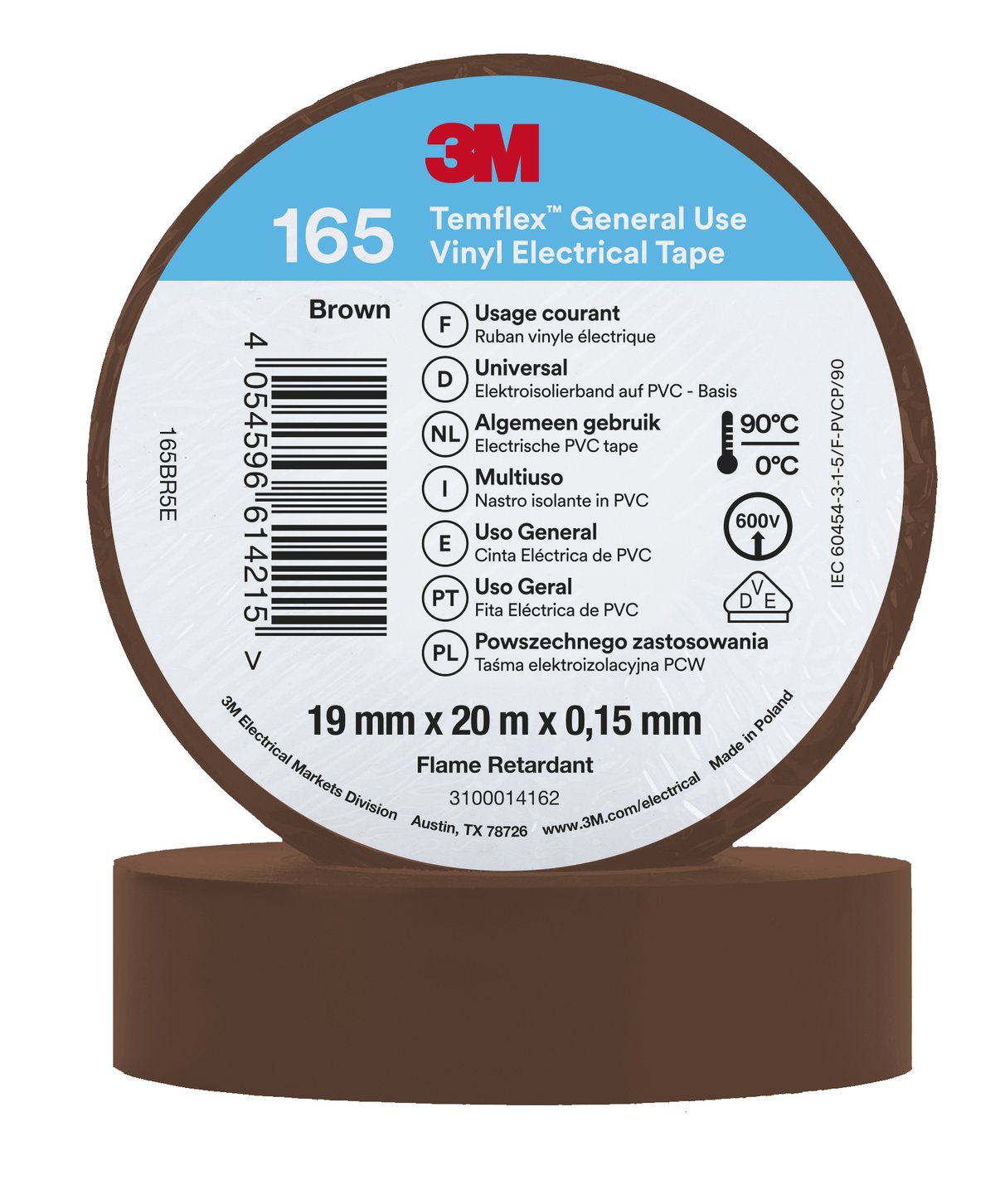3M™ Temflex™ Vinyl-Isolierband 165 ist ein hochwertiges 0,15 mm (6 mil) dickes, universell einsetzbares Isolierband in hoher Qualität. Es ist hochbeständig gegen Feuchtigkeit und sich ändernde Witterungsbedingungen. Es ist ein flammhemmendes Polyvinylchlorid-Band (PVC) und anpassungsfähig in der Anwendung. Das 3M Temflex 165 Klebeband bietet hervorragenden mechanischen Schutz bei minimalem Volumen. Es handelt sich um ein UL-gelistetes und CSA-zertifiziertes Isolierband. Bei der Herstellung werden keine Lösungsmittel verwendet.