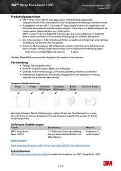 Mit der 3M™ Wrap-Folie 1080 lassen sich einzigartige Designs auf Autos, Motorrädern oder Bussen realisieren. Von glänzenden und matten Farbtönen, über Metallic-Töne und gebürstetes Metall bis zu Carbon-Designs – die 3M™ Wrap-Folie 1080 lässt Fahrzeuge in einem neuen und besonders attraktiven Look erstrahlen. • Mehrschichtig gegossene PVC-Folie (90 µm) • Positionierbar dank Controltac™, repositionierbar durch abgestimmte Initialhaftung • Blasenfrei applizierbar dank Comply™ • 1,52 m Rollenbreite, ideal zur nahtlosen Verklebung großer Fahrzeugflächen • Applikation auf gebogene und gewölbte Oberflächen, auch in leichte Sicken und über Nieten • Funktionsdauer bis 6 Jahre • Spezialklebstoff (mit Wärme ablösbar), grau eingefärbt für gute Untergrundabdeckung