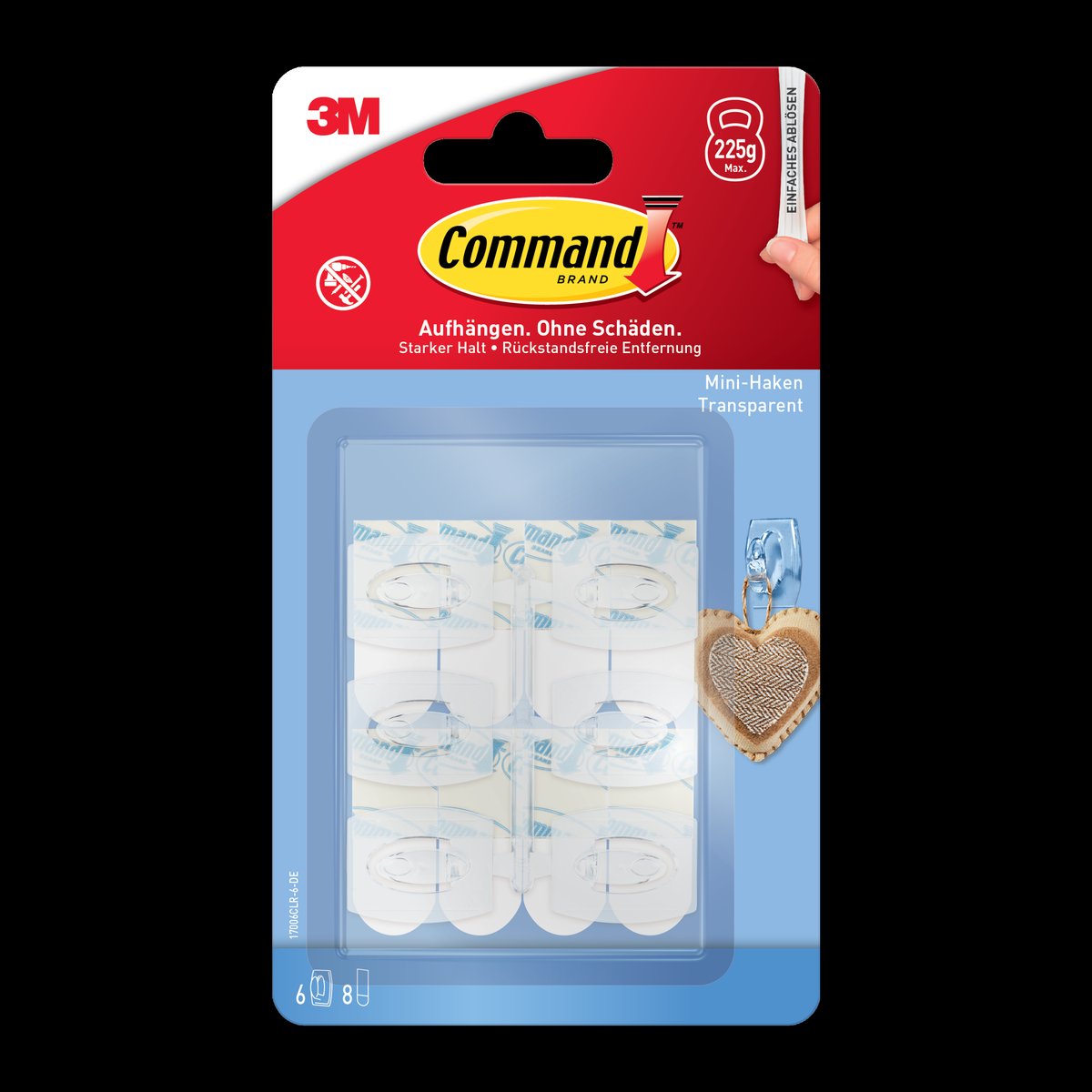 Transparente Command™ Mini-Haken mit transparenten Strips sind unsere innovative Lösung zum sicheren und beschädigungsfreien Aufhängen von Dekoartikeln, Kalendern und anderen leichten Objekten. Sie gewährleisten einen starken Halt und lassen sich rückstandsfrei ablösen – beschädigungsfrei dank 3M Technologie.