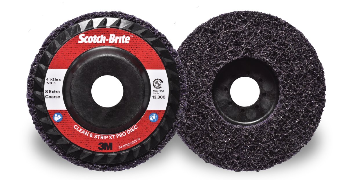 Die Scotch-Brite™ Grobreinigungsscheibe XT Pro besteht aus Siliziumcarbid, das in eine offene Nylonfaserkonstruktion integriert ist. Unsere Scheiben entfernen effektiv Rost, Farben, Zunder, Beschichtungen und Klebstoffe von Oberflächen, ohne das Grundmaterial wesentlich zu verändern.