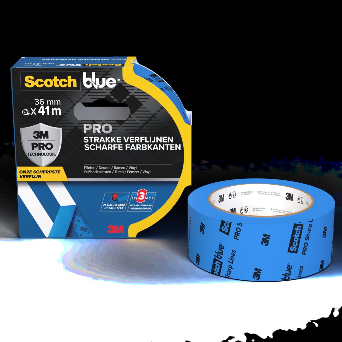 Mit dem ScotchBlue™ PRO Malerabdeckband für scharfe Linien erzielen Sie auf einer Vielzahl von Oberflächen im Innen- und Außenbereich superscharfe Farblinien. Es lässt sich bis zu 21 Tage rückstandsfrei ablösen. Dieses mit modernster Technik von 3M entwickelte Abdeckband mit mittlerer Klebkraft stellt superscharfe Farblinien und präzise Ergebnisse an Türen, Fenstern, Fußleisten und sogar auf PVC-Oberflächen sicher. Dank seiner UV-Beständigkeit kann dieses hochwertige Abdeckband für scharfe Linien bei direkter Sonneneinstrahlung eingesetzt werden.