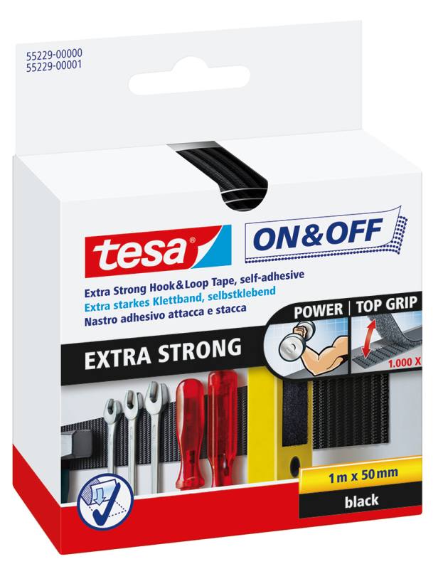 Eigenschaften von tesa® On & Off Extrastarkes Klettband, 1m x 50mm, transparent