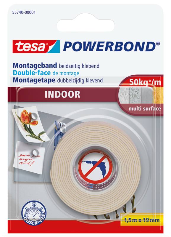 Das leistungsstarke Montageband tesa Powerbond® Indoor ist die clevere Befestigungsalternative zu Schrauben und Nägeln. Anstatt im Innenbereich zu bohren oder zu hämmern, nutzen Sie das doppelseitige Klebeband. Sie realisieren Ihre Handwerker-Projekte schnell und sauber und benötigen bei der Anwendung kein zusätzliches Werkzeug. Mit einer Haftkraft von bis zu 5 kg pro 10 cm gibt das Montageband auch schwereren Objekten wie Bildern, Schlüsselkästen oder großen Deko-Elementen einen sicheren Halt. Die Handhabung des Klebebands ist denkbar einfach und wird nochmals erleichtert, da es sich kleinen Unebenheiten anpasst.